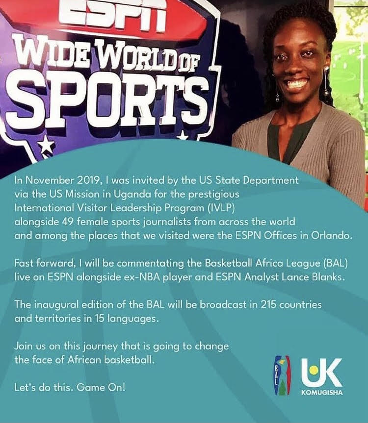 She later attended the first-ever International Visitor Leadership Program (IVLP) on ‘Women’s Empowerment Through Sports Journalism’ courtesy of the United States Department of State thanks to the US Mission in Uganda.